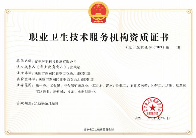 遼寧環(huán)亞科技檢測有限公司秉承“公平、公正、客觀、真實(shí)”的服務(wù)理念,力求為遼寧省各企事業(yè)等用人單位提供更優(yōu)質(zhì)的服務(wù),公司領(lǐng)導(dǎo)率領(lǐng)全體員工歷時(shí)一年零八個(gè)月的時(shí)間操練各項(xiàng)基本技能,于2016年8月9日取得了(遼)安職技字(2016)第B-0019號(hào)《職業(yè)衛(wèi)生技術(shù)服務(wù)機(jī)構(gòu)資質(zhì)證書》